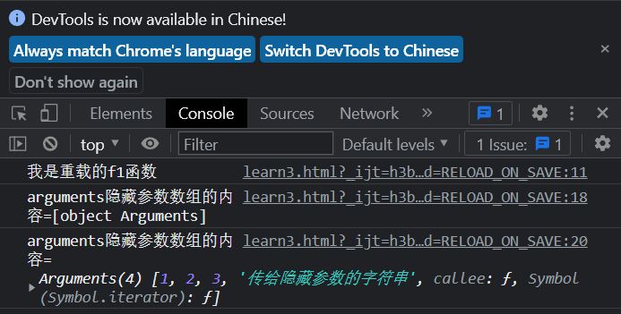 <script> function f1(){ console.log("定义的函数f1()"); } //重载f1() function f1(){ console.log("我是重载的f1函数"); } //调用f1函数,这里调用的是最下面的f1函数 f1(); //函数隐藏形参演示 function f2(){ //使用 "+" 拼接.显示的是arguments的数据类型 console.log("arguments隐藏参数数组的内容=" +arguments); //使用逗号连接,显示的是数组里的参数 console.log("arguments隐藏参数数组的内容=" ,arguments); } f2(1,2,3,"传给隐藏参数的字符串"); </script>