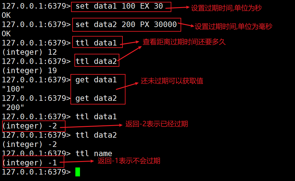 #语法 set 键 EX 秒 set 键 PX 毫秒 #例如 #设置数据10秒后过期 set data1 EX 10 #设置数据10000毫秒后过期 set data2 PX 10000