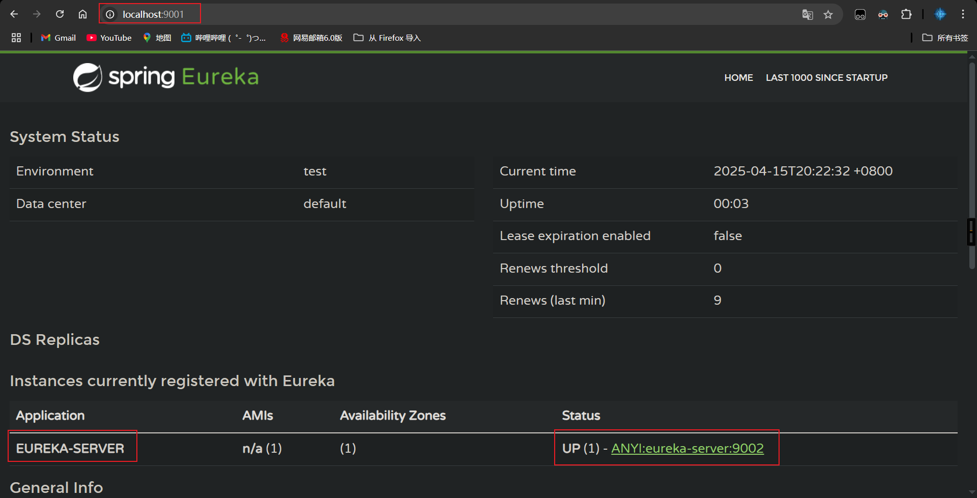 - 打开浏览器访问'http://localhost:9001/'Euerka Server服务注册中心,检验Eureka Client是否注册到Euerka Server服务注册中心