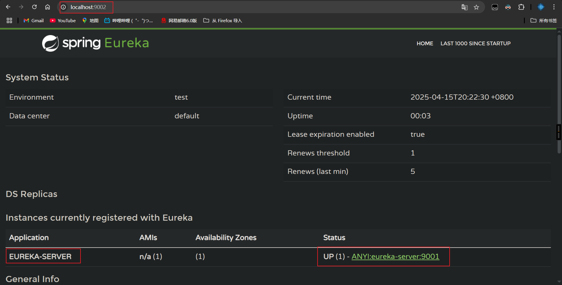 server: port: 9002 spring: application: name: eureka-server eureka: instance: #Eureka服务端的实例名称 hostname: localhost client: #配置向服务中注册自己,搭建集群 register-with-eureka: true #配置向服务中抓取注册信息 fetch-registry: true #配置服务注册中心的地址 service-url: #向Eureka Server 9001相互注册 defaultZone: http://localhost:9001/eureka server: #设置自我保护机制,默认开启 enable-self-preservation: true #心跳机制时间间隔(单位毫秒,默认是30*1000) eviction-interval-timer-in-ms: 2000- 配置Eureka Server 9001向Eureka Server 9002注册
