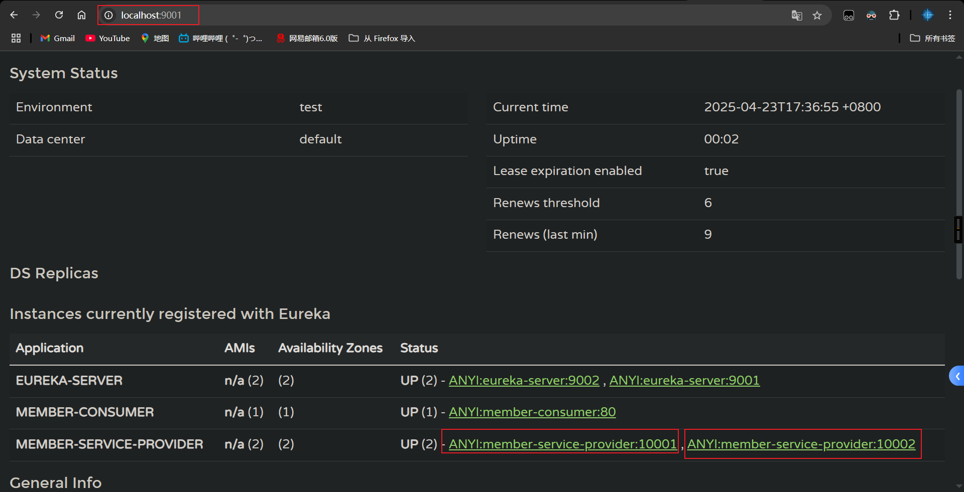 server: port: 10002 servlet: context-path: /member-provider spring: application: name: member-service-provider datasource: type: com.alibaba.druid.pool.DruidDataSource druid: url: jdbc:mysql://localhost:3306/spring_cloud?useUnicode=true&characterEncoding=utf-8&useSSL=false&serverTimezone=UTC username: root password: hsp driver-class-name: com.mysql.jdbc.Driver mybatis-plus: configuration: log-impl: org.apache.ibatis.logging.stdout.StdOutImpl eureka: instance: #配置注册到Eureka Server中的名称 appname: member-service-provider #心跳检测和续约的间隔时间 #Eureka Client向Eureka Server发送心跳信息的间隔时间 lease-renewal-interval-in-seconds: 30 #Eureka Server在收到最后一次心跳后等待的时间上限,超时将剔除该服务实例,默认是90秒 lease-expiration-duration-in-seconds: 90 client: #是否将自己注册到Eureka Server中 register-with-eureka: true #是否从Eureka Server中获取注册信息,单节点不拉取也可以,集群部署时,需要拉取服务注册信息才能实现负载均衡 fetch-registry: true #Eureka Server的地址 service-url: #配置两个Eureka Server的地址,用逗号分割 defaultZone: http://localhost:9001/eureka/,http://localhost:9002/eureka/- 配置member-service-provider_10001模块向两个Eureka Server注册