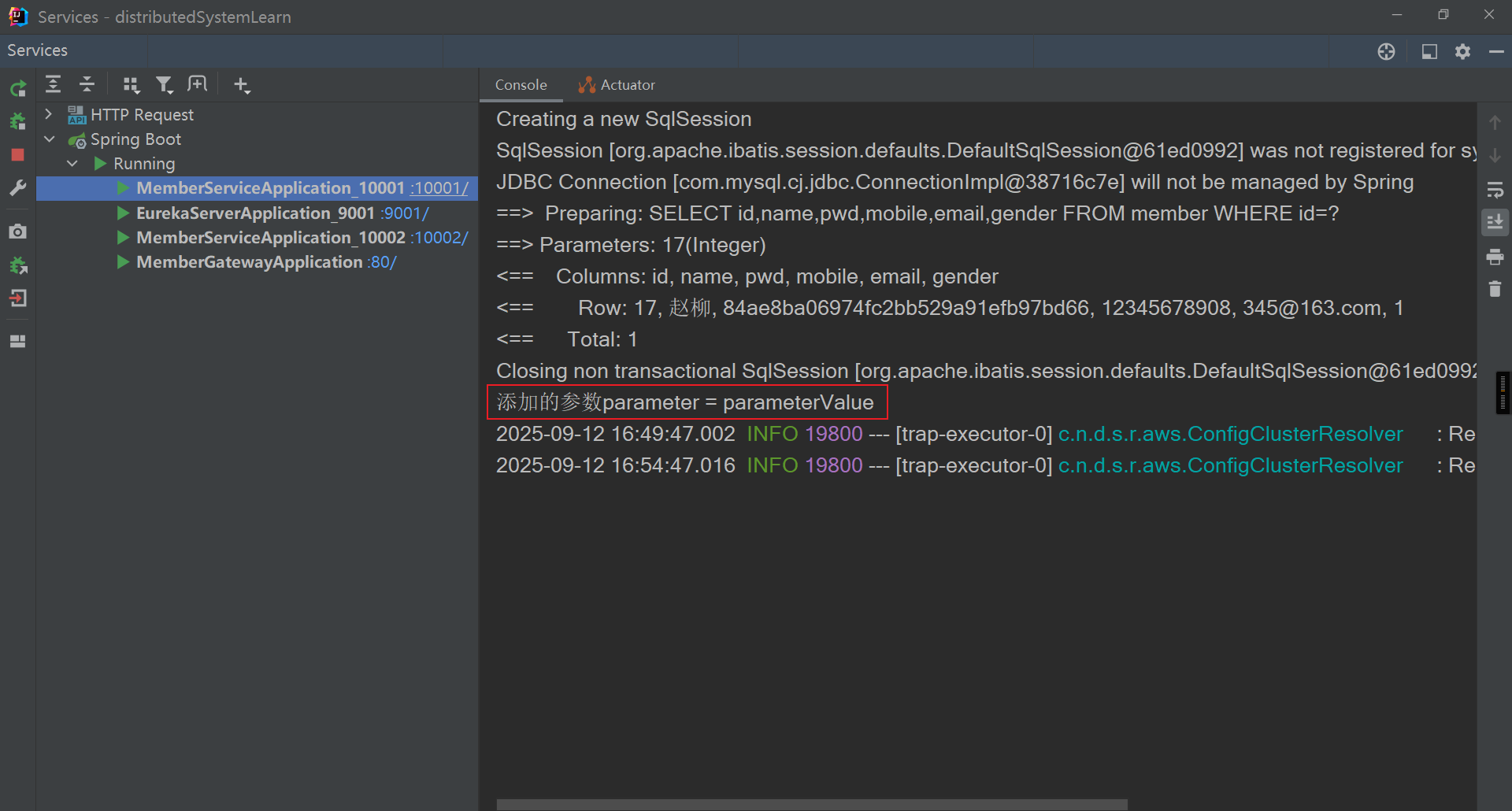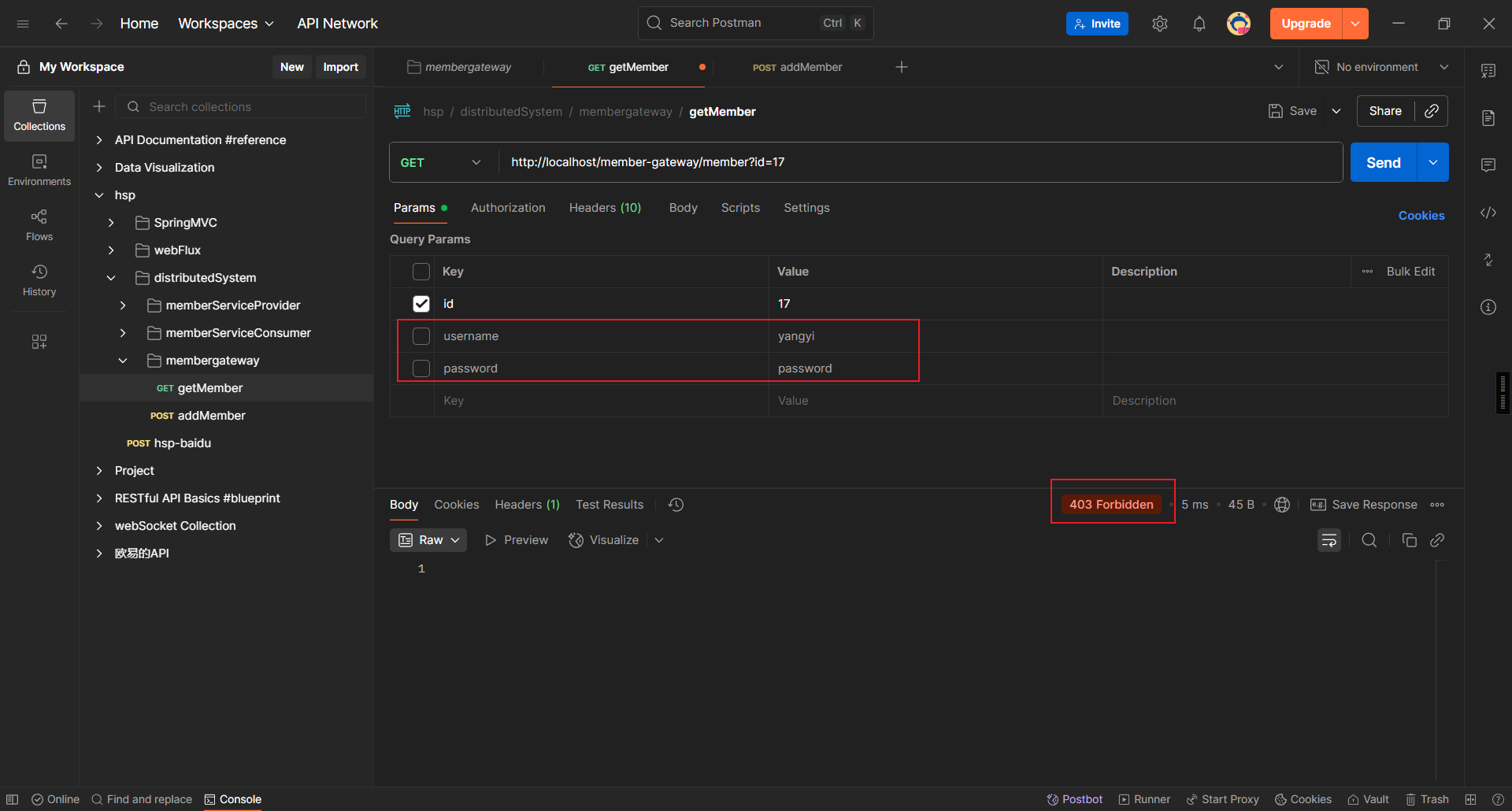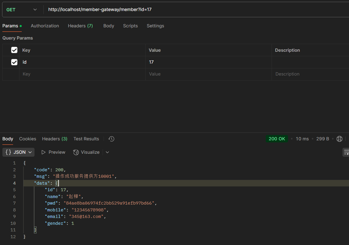 spring: application: name: member-gateway cloud: gateway: #配置路由,可以配置多组 routes: #配置路由的id,需要全局唯一,查询数据使用该路由 - id: member10001 #路由转发的URI,最终转发的URL = URI + PATH uri: http://localhost:10001 #配置路由的断言,满足条件时才进行路由 predicates: #路径断言 - Path=/member-gateway/member #方法断言 - Method=GET filters: #重写路径,将请求路径中的member-gateway替换为member-provider,使用到正则表达式的命名捕获分组,语法格式:(?<捕获分组名称>pattern),引用捕获分组:$\{捕获分组名称} - RewritePath=/member-gateway/(?<segment>.*), /member-provider/$\{segment} #第二组路由,新增数据使用该路由 - id: member10002 uri: http://localhost:10002 predicates: - Path=/member-gateway/member - Method=POST filters: - RewritePath=/member-gateway/(?<segment>.*), /member-provider/$\{segment}- 通过配置类配置
