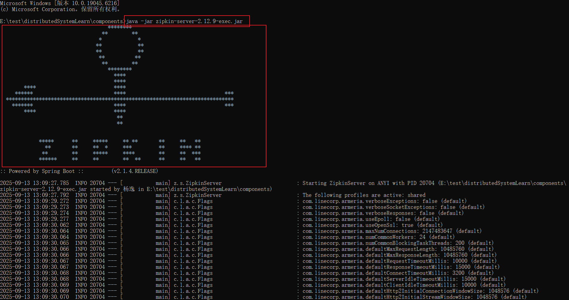 java -jar zipkin-server-2.12.9-exec.jar命令运行,出现下图的标志则说明运行成功