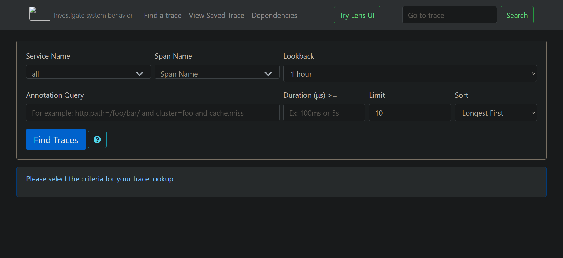 默认的运行端口是9411,使用浏览器访问http://localhost:9411/zipkin/