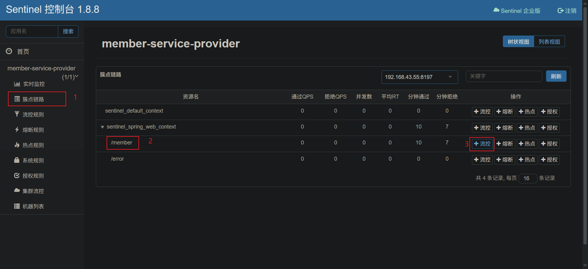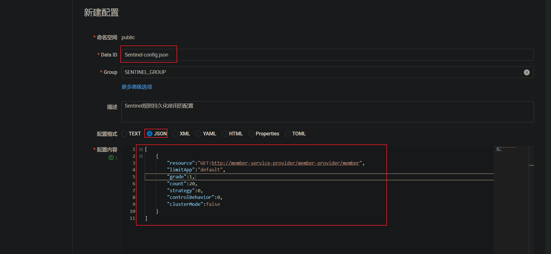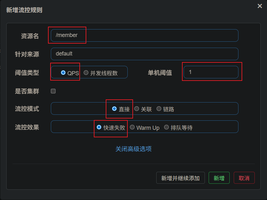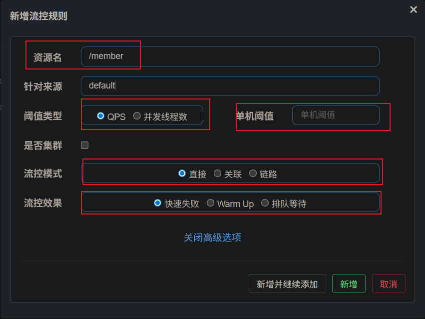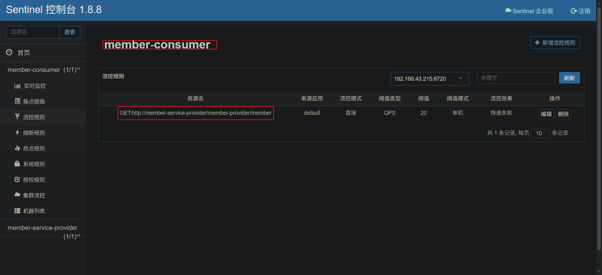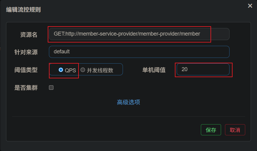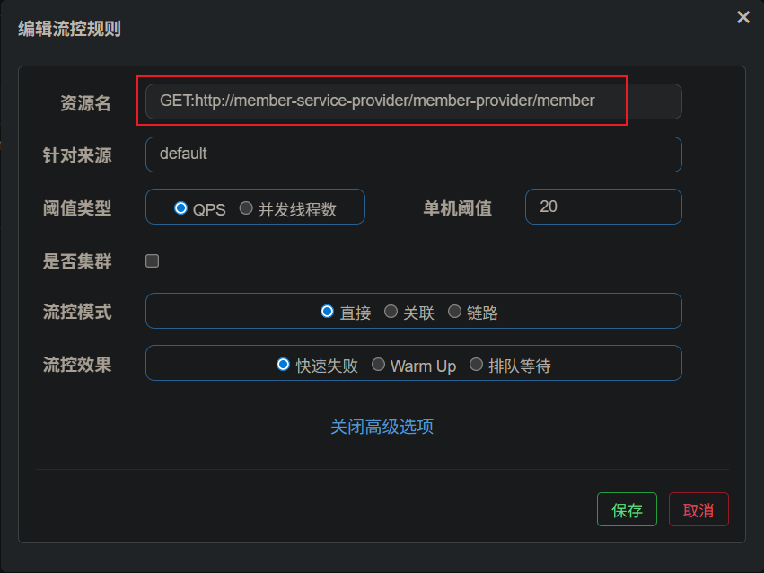 [ { //资源名称 "resource":"GET:http://member-service-provider/member-provider/member", //调用来源 "limitApp":"default", //阈值模式 "grade":1, //阈值 "count":20, //流控模式 "strategy":0, //流控效果 "controlBehavior":0, //是否集群 "clusterMode":false } ] -
