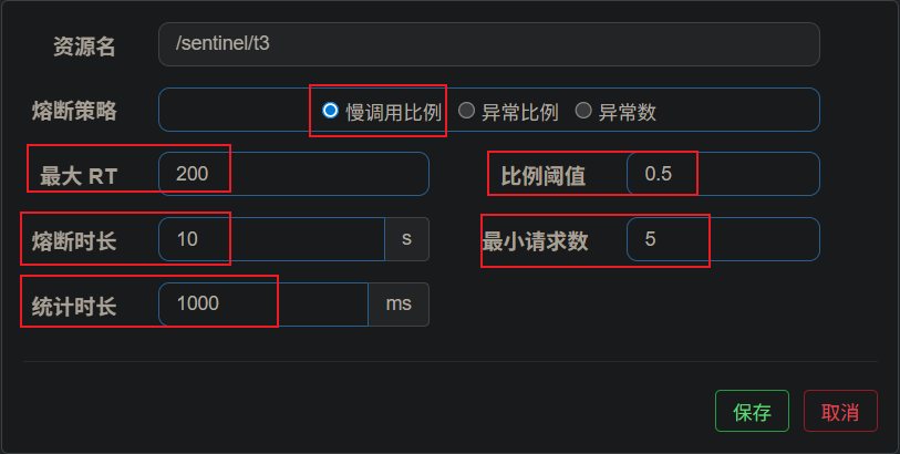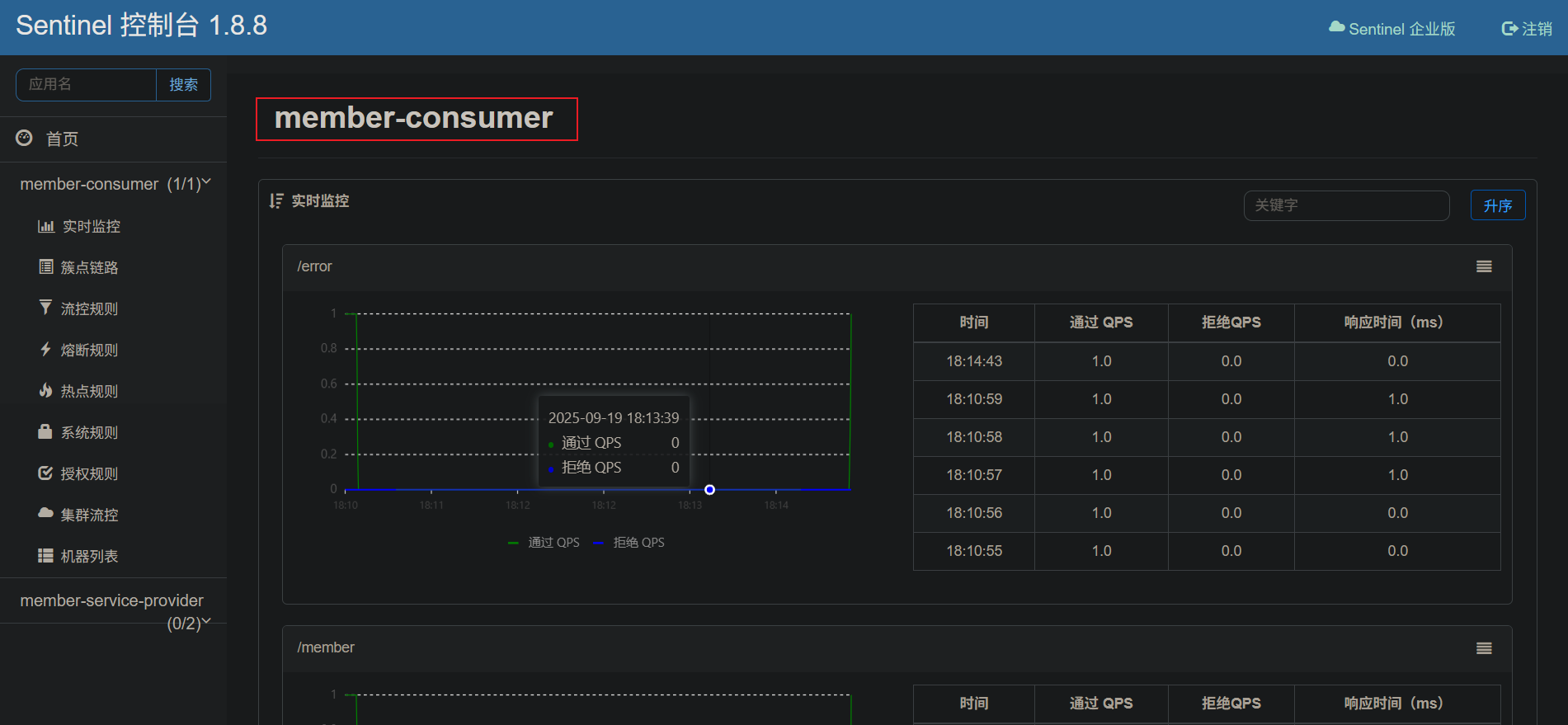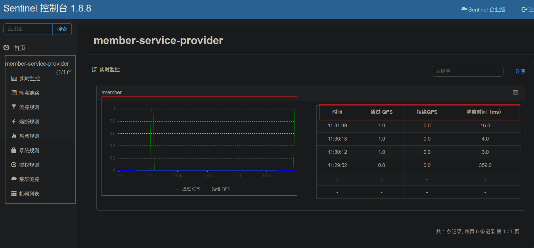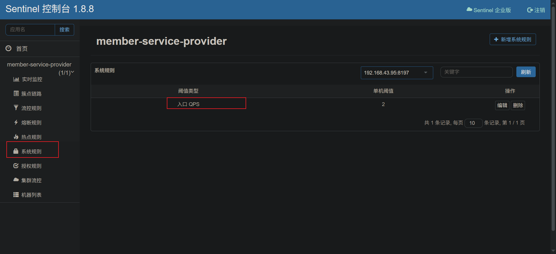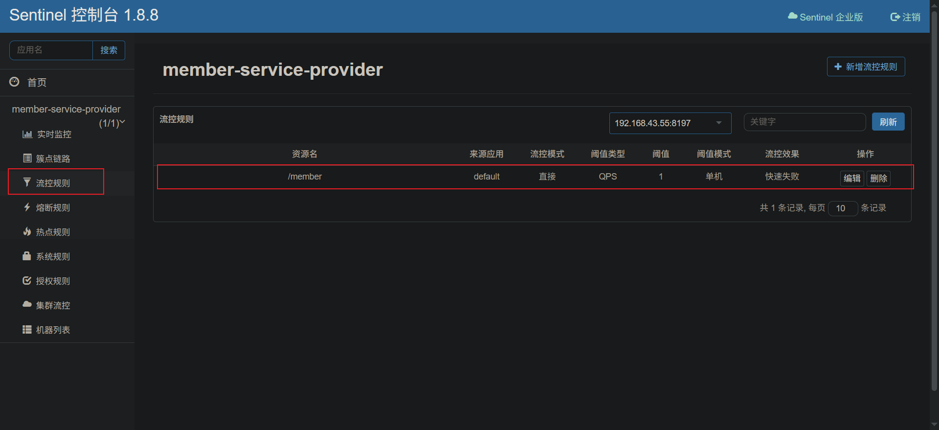 [ { //资源名称 "resource":"GET:http://member-service-provider/member-provider/member", //调用来源 "limitApp":"default", //阈值模式 "grade":1, //阈值 "count":20, //流控模式 "strategy":0, //流控效果 "controlBehavior":0, //是否集群 "clusterMode":false } ] -