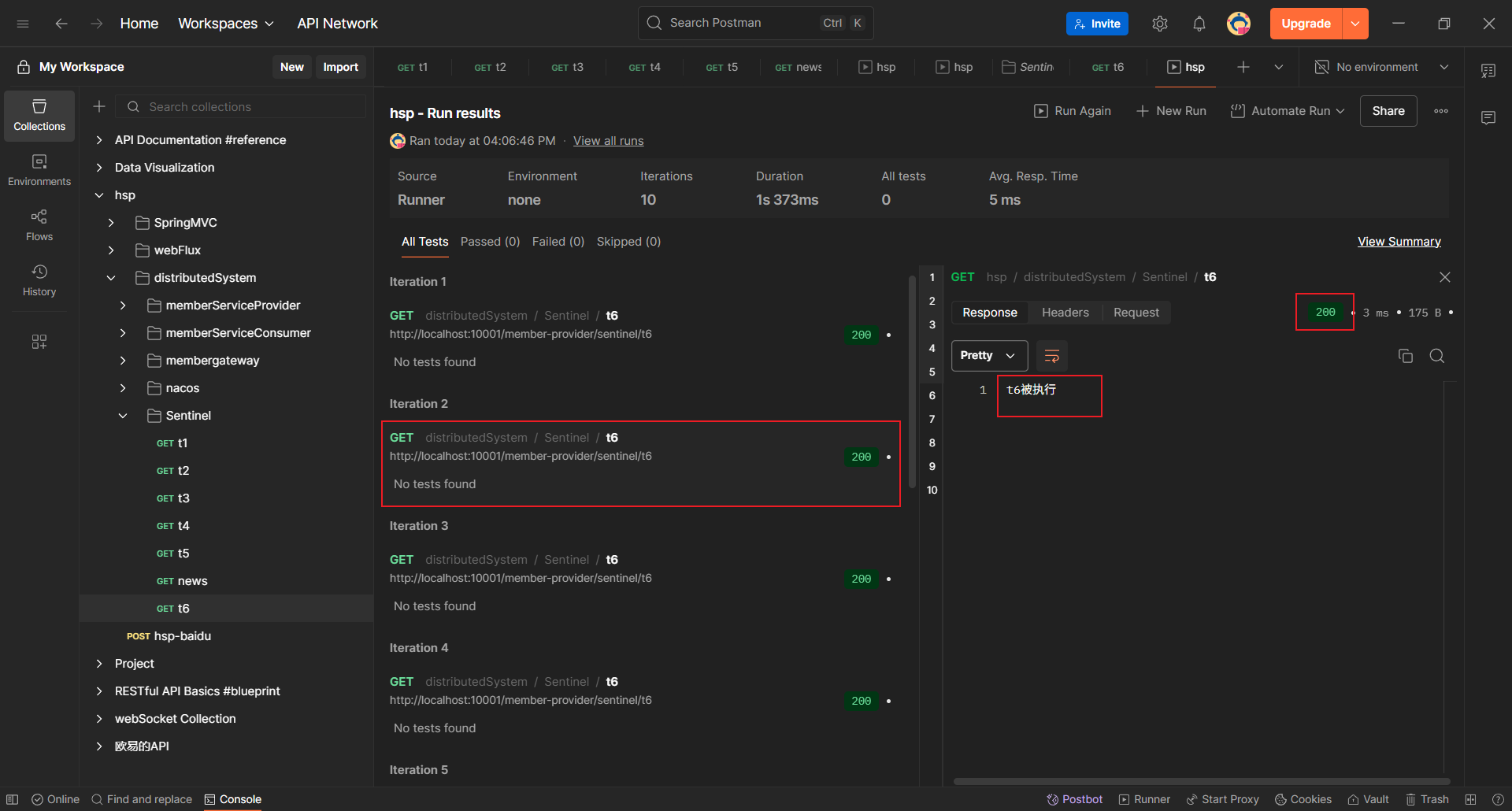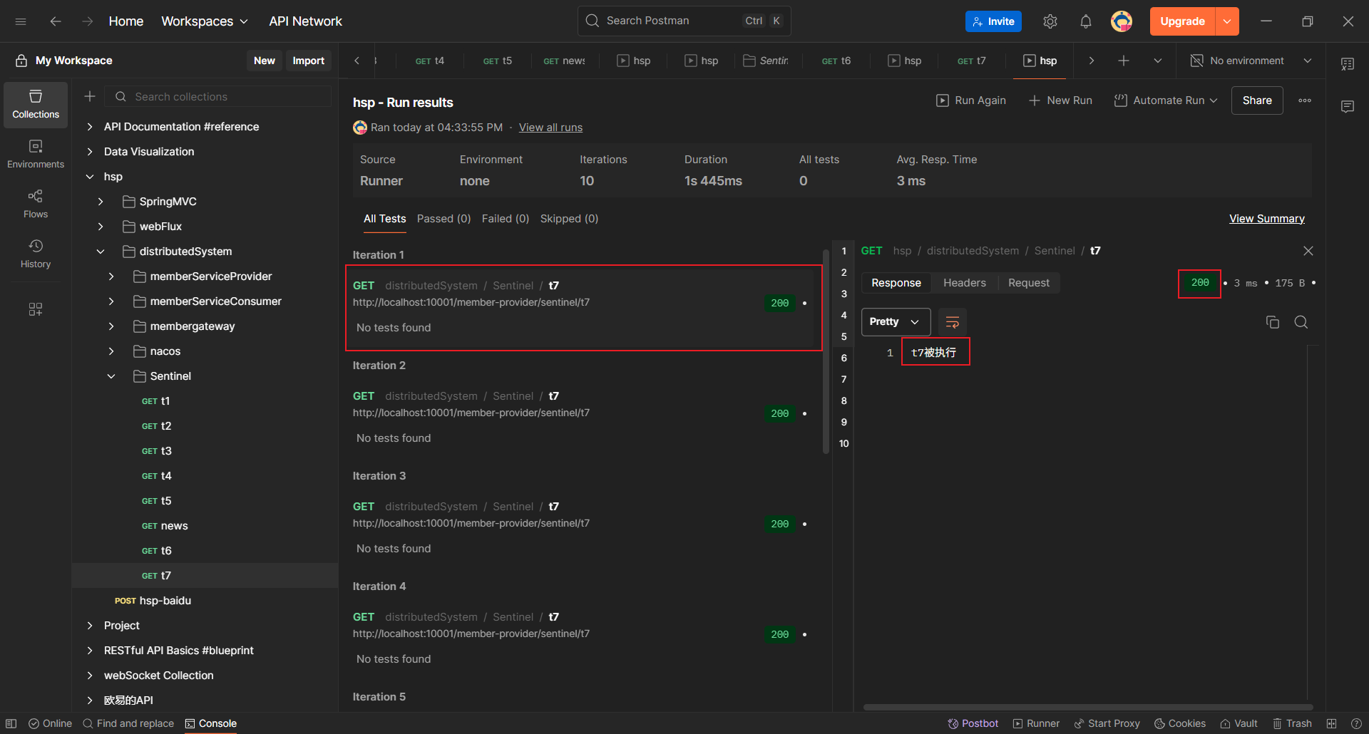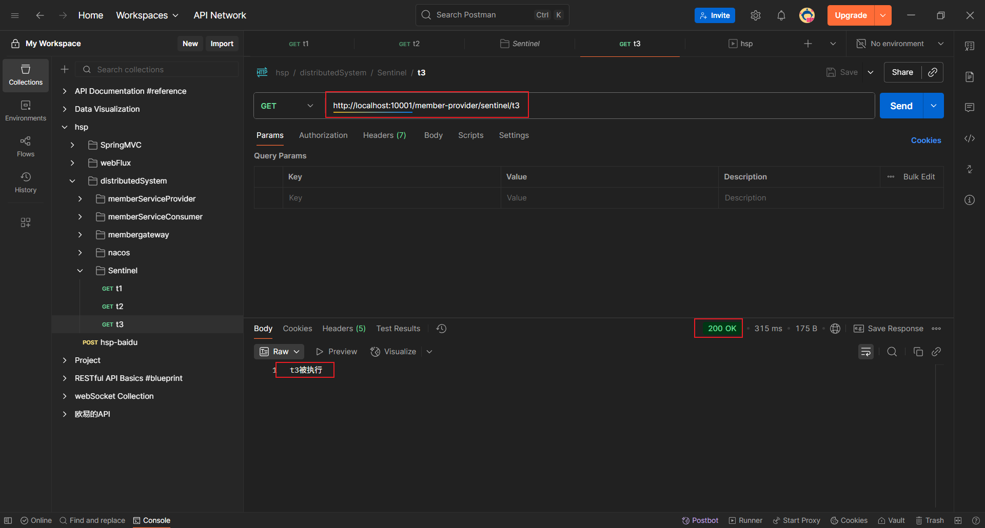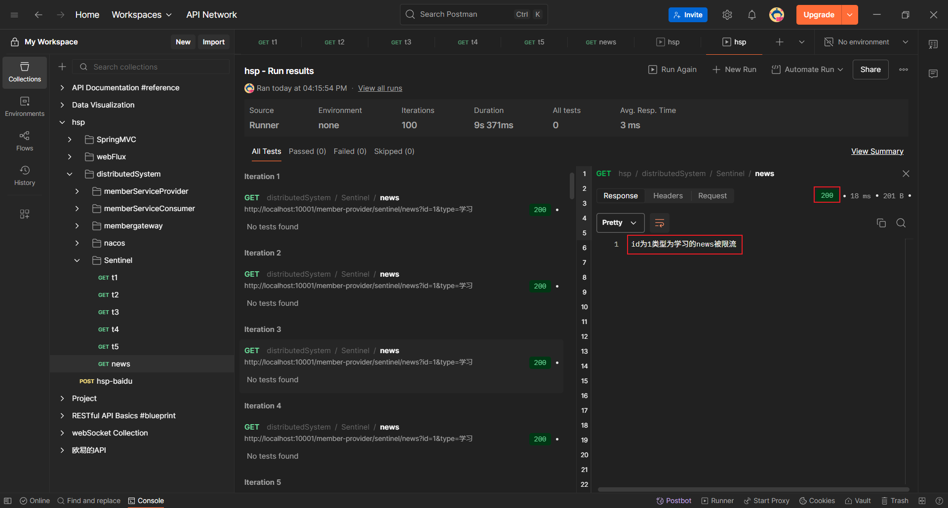 运行微服务,然后通过postman进行接口调用,最后查看Sentinel Dashboard验证微服务成功集成Sentinel客户端
