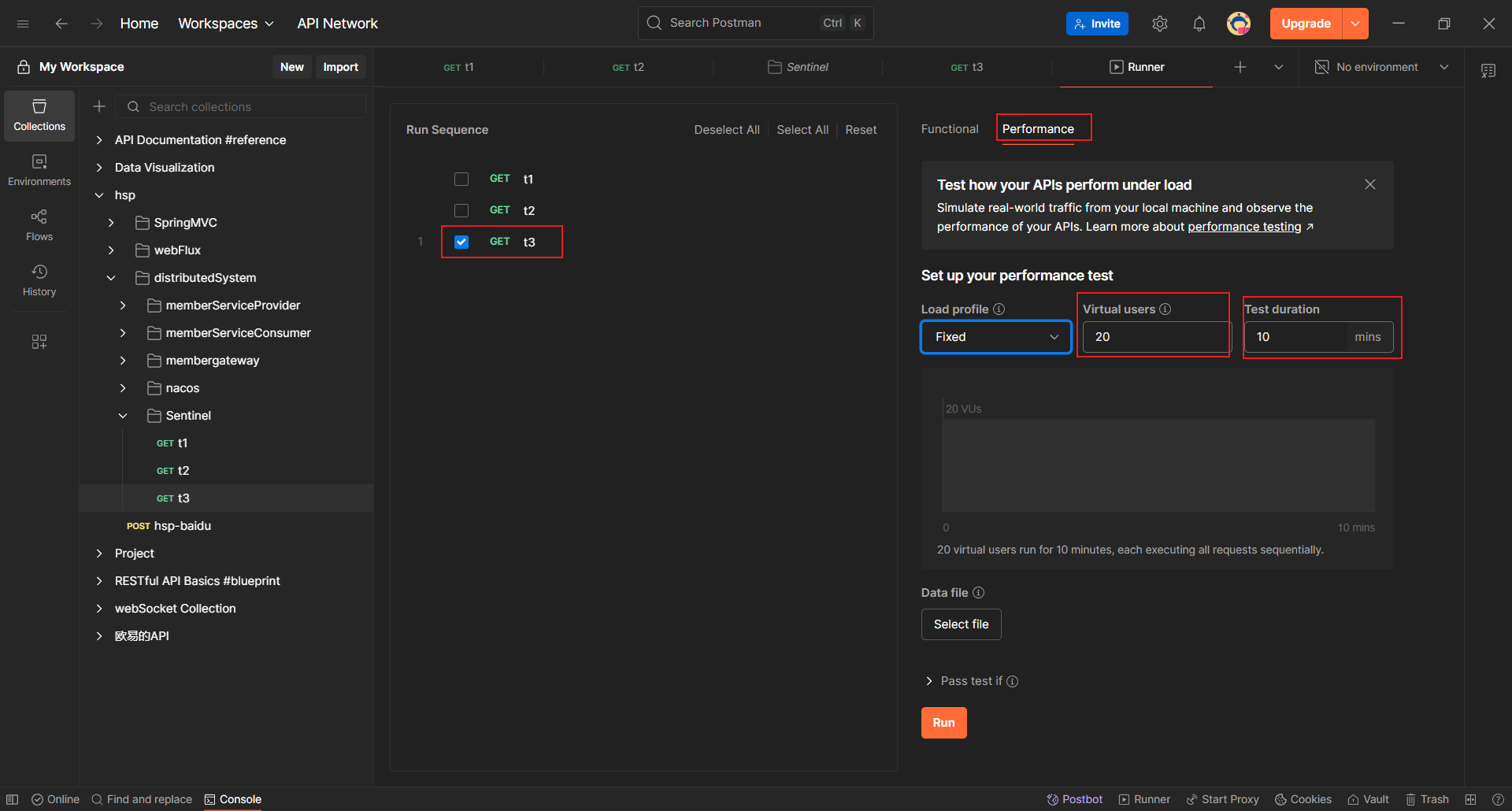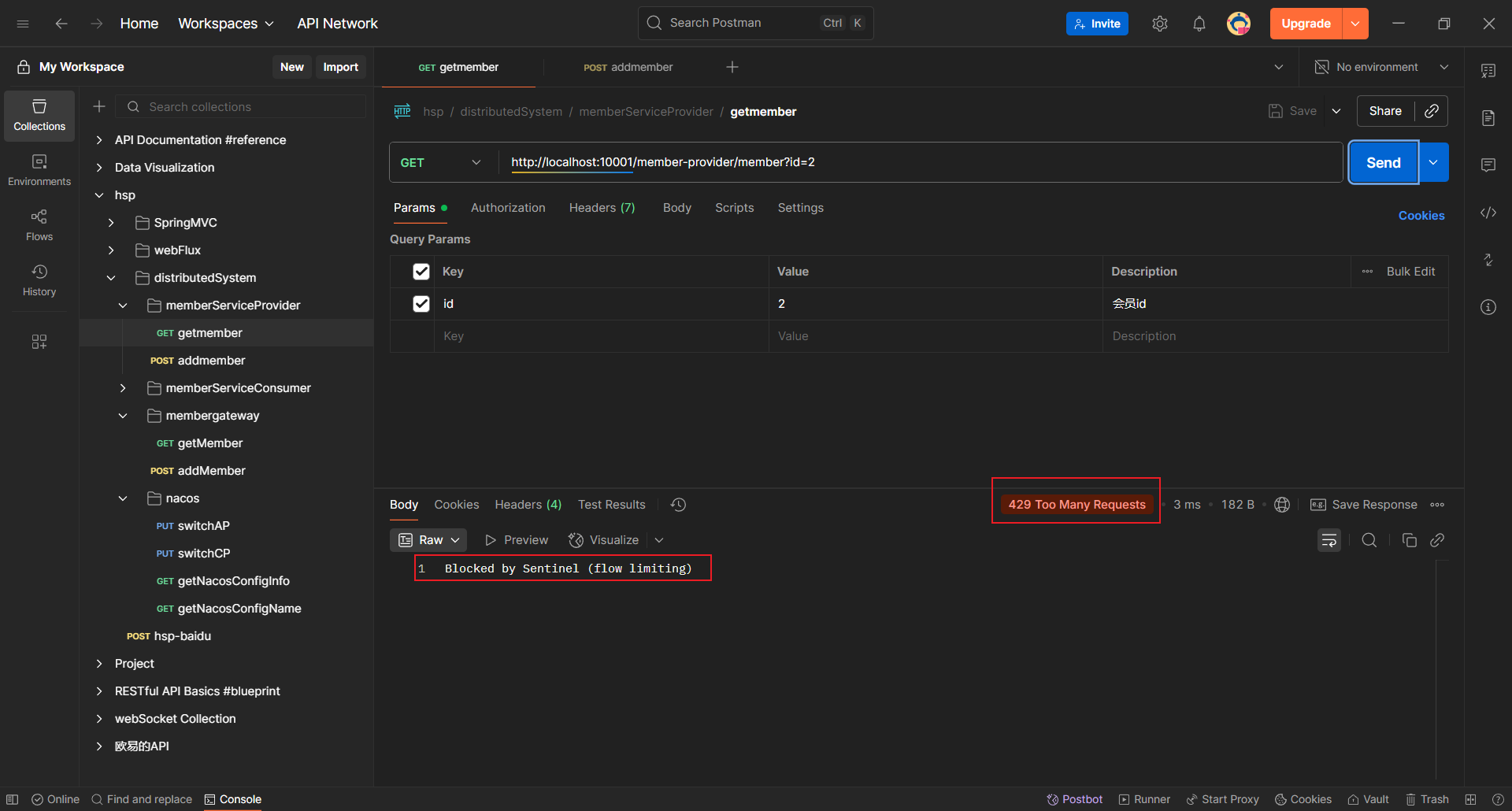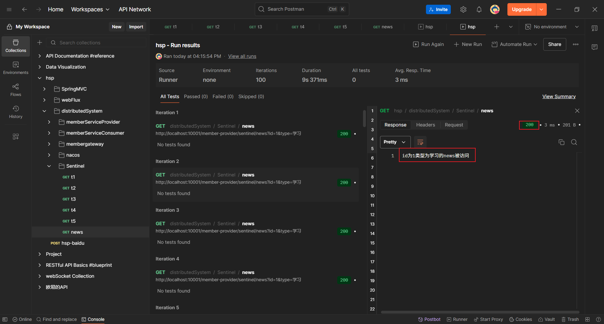 运行微服务,然后通过postman进行接口调用,最后查看Sentinel Dashboard验证微服务成功集成Sentinel客户端