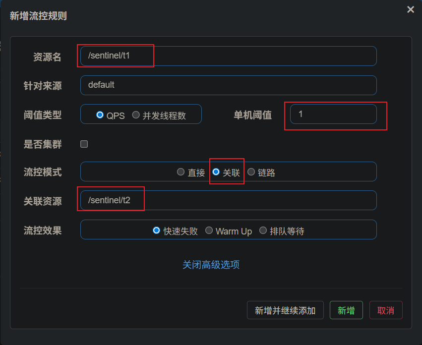 对资源"t1"添加关联流控规则,关联资源为"t2"