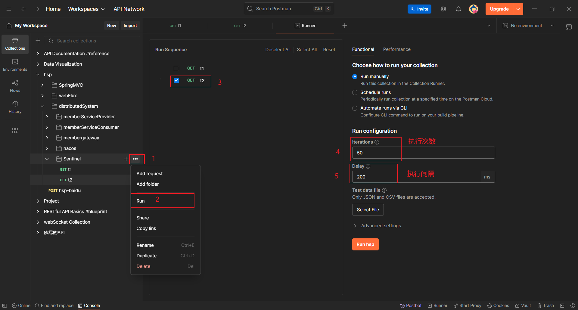 使用postman对接口"t2"进行QPS为50,间隔为200ms,同时访问接口"t1",验证限流效果