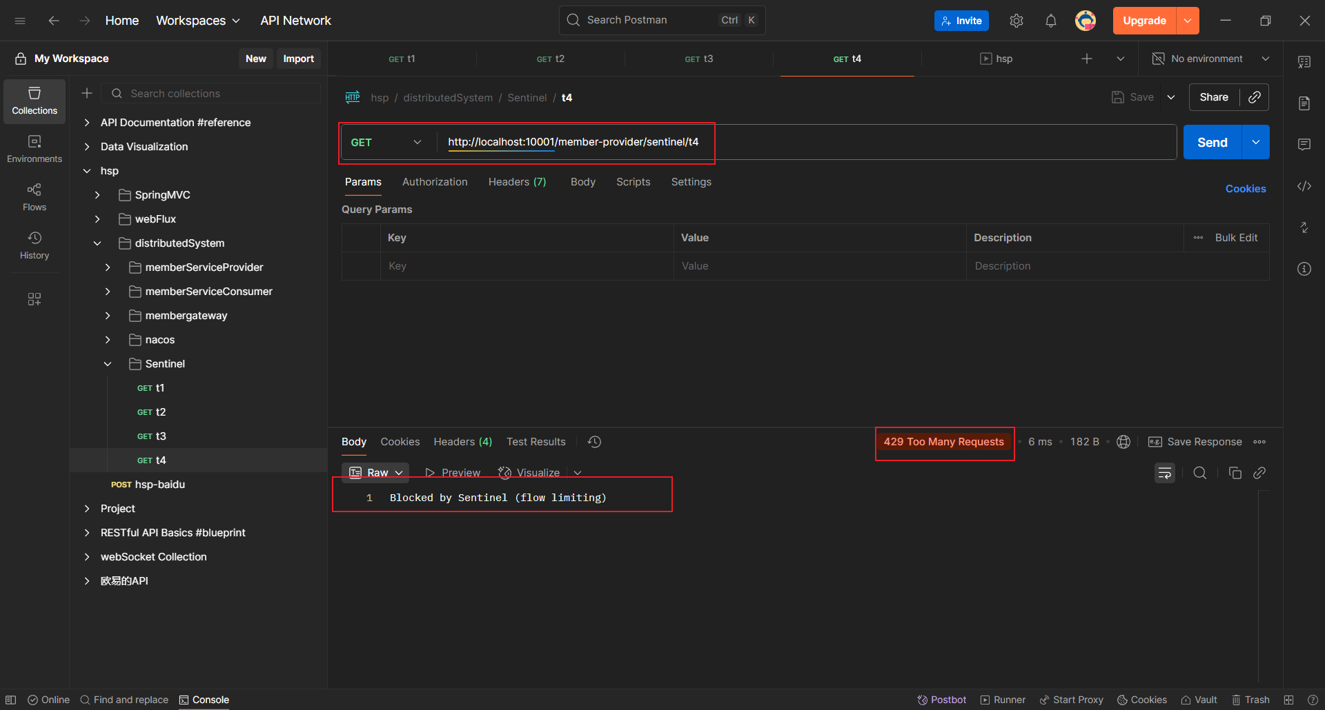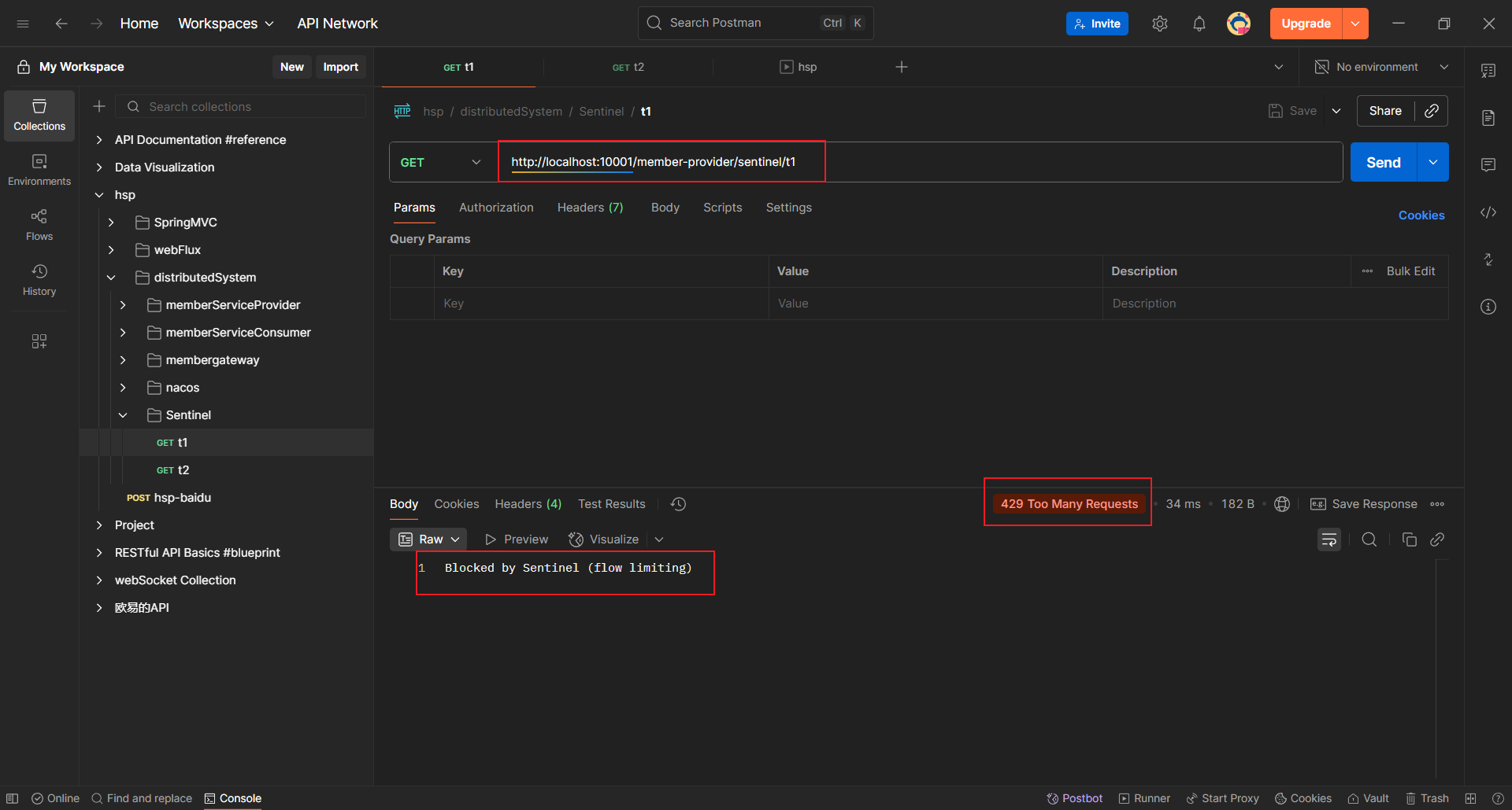- 当"t2"处于并发时访问"t1",验证限流效果