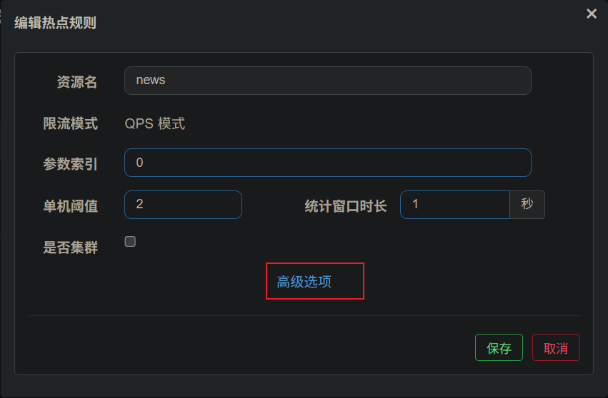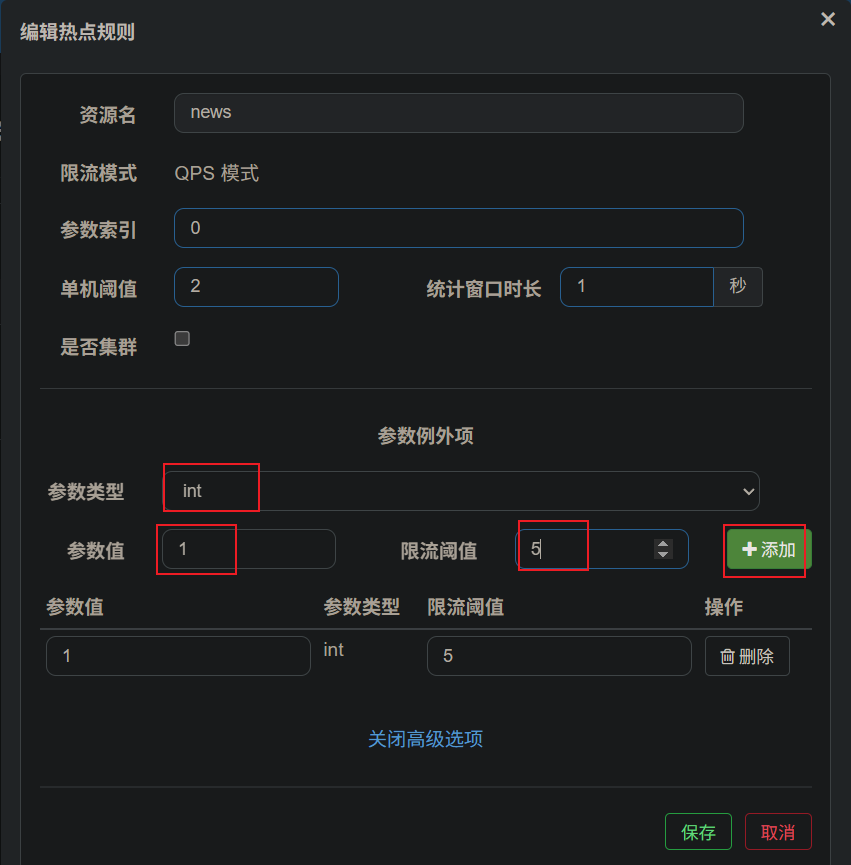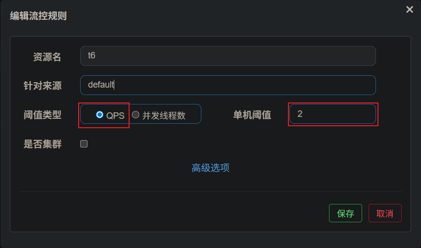 参数名 说明 取值与含义 resource 资源名称 被保护的具体资源标识 limitApp 来源应用 default-所有来源,或指定具体应用名 grade 阈值类型 0: 线程数(并发数)