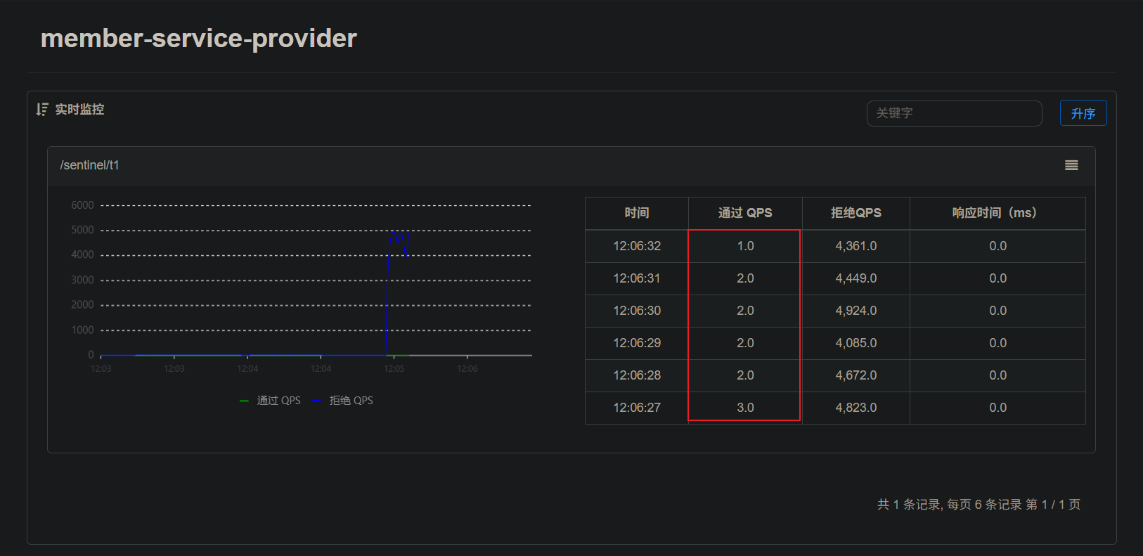案例:当关联资源"t2"的QPS大于1时,限流资源"t1"
