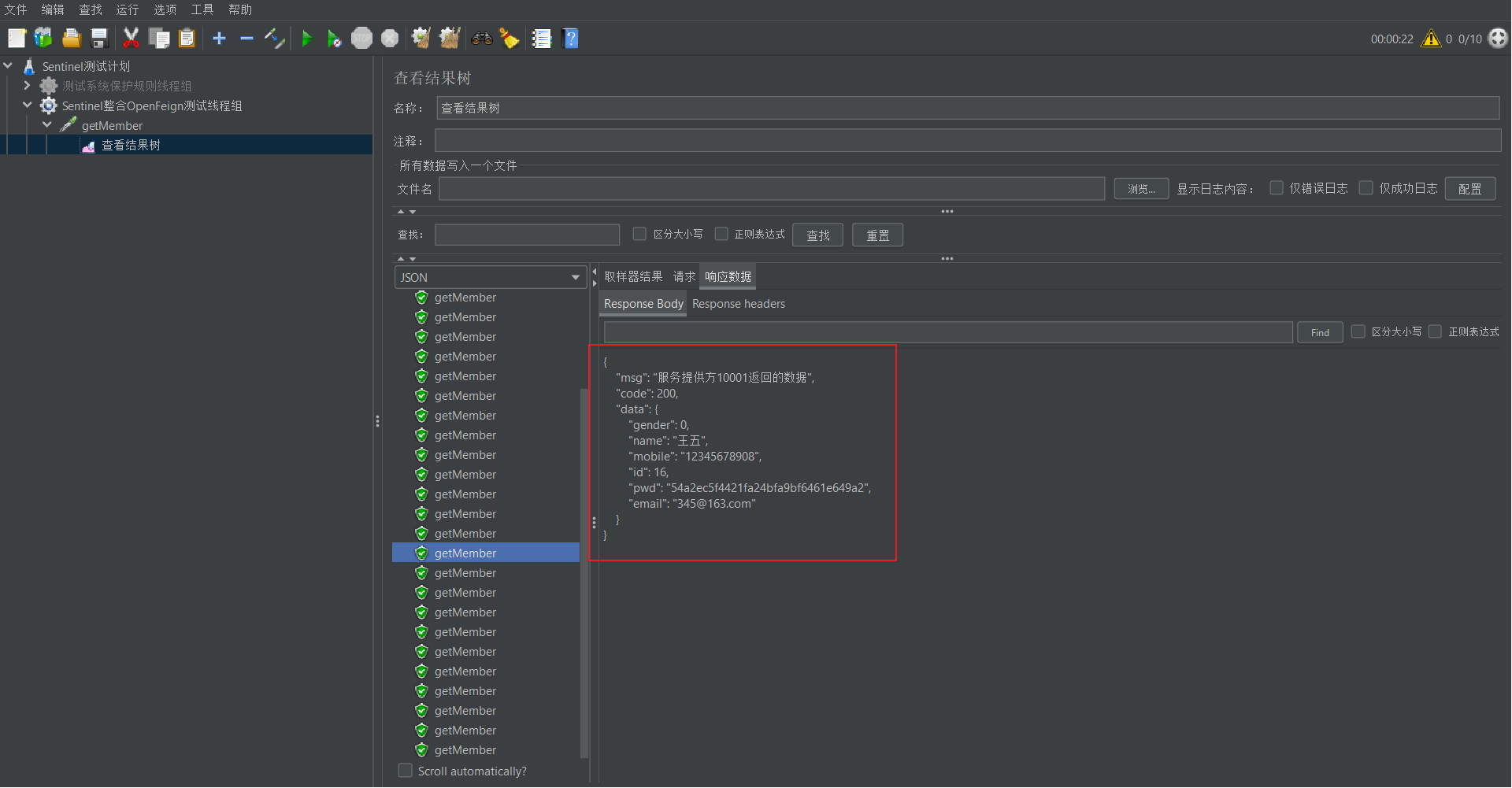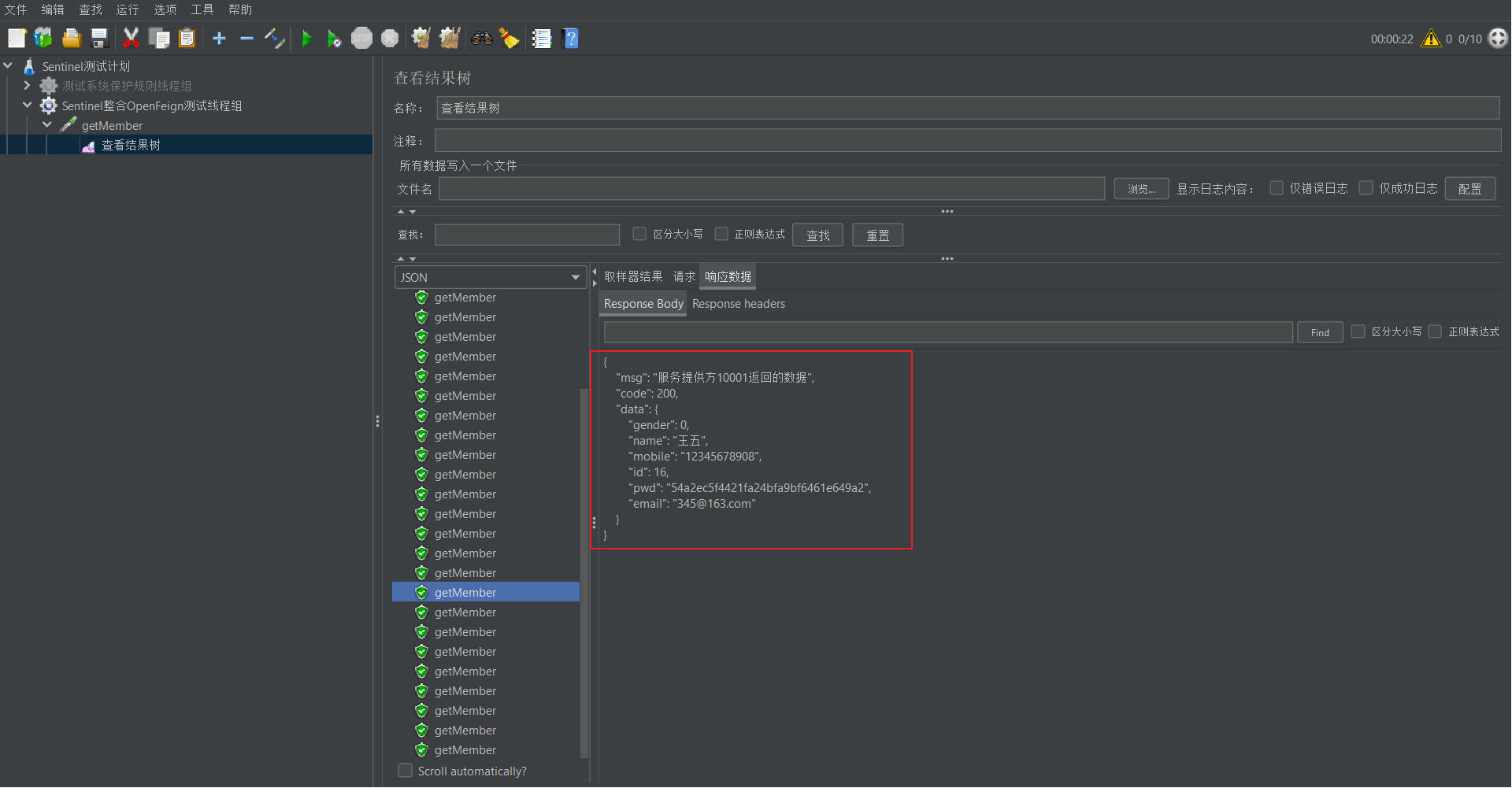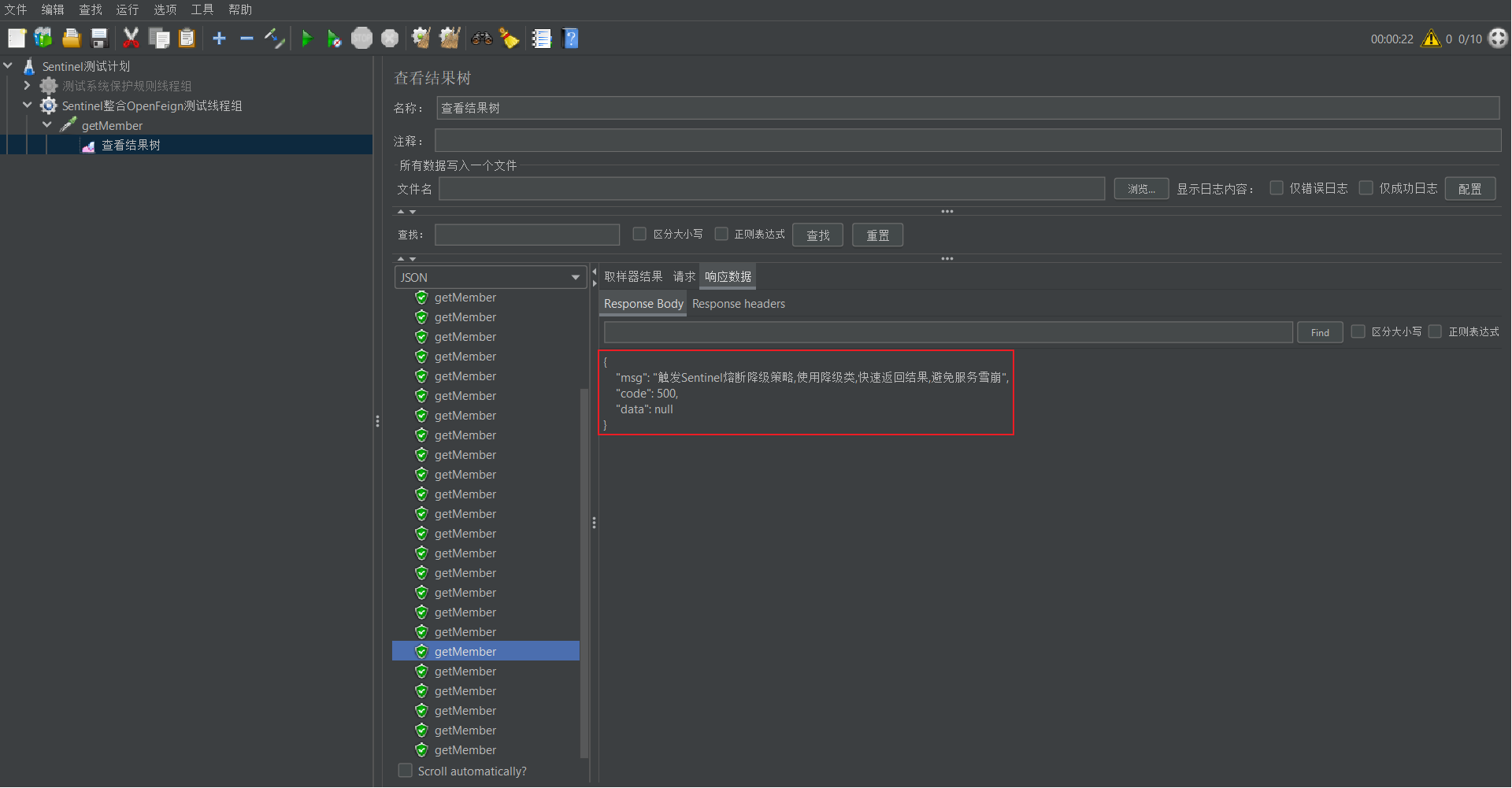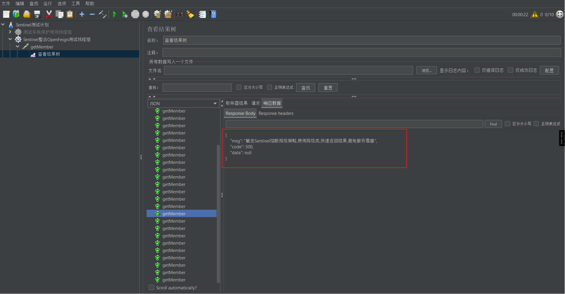 使用jmeter进行压力测试,验证Sentinel整合OpenFeign是否成功,测试能否触发限流规则使用降级类进行响应处理